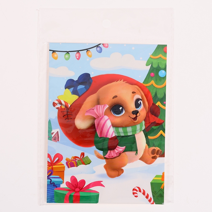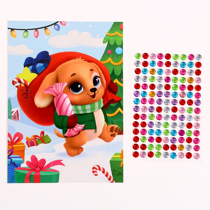 Аппликация стразами на новый год для детей «Щенок с подарками», А6, новогодний набор для творчества