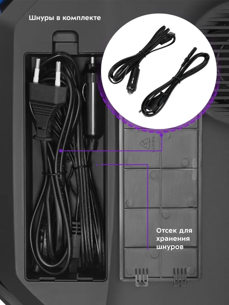 Автомобильный холодильник поставляется с сетевым (для питания от сети 220 В) и автомобильным (для подключения к прикуривателю) шнурами. Это делает автохолодильник универсальным и с неограниченным радиусом использования.
