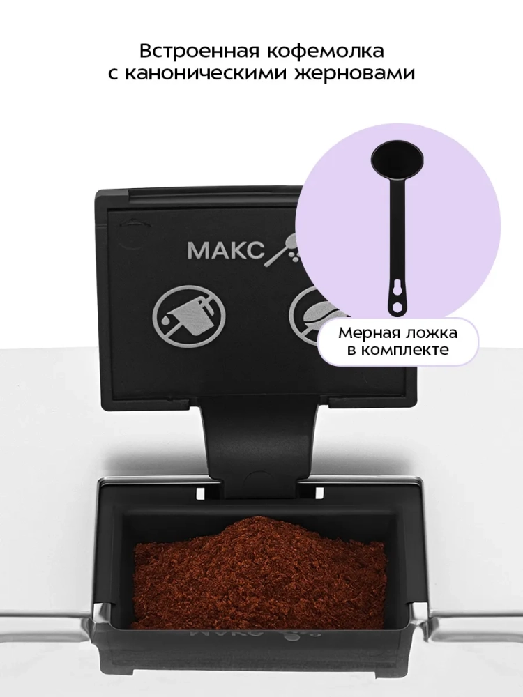 Встроенная кофемолка позволяет качественно измельчать кофейные зерна непосредственно перед приготовлением кофе, что положительно отражается на вкусе готового напитка. Кофемолка имеет металлические конические жернова, которые препятствуют излишнему перегреванию зерен при измельчении и позволяют получить равномерный помол. Вы можете отрегулировать степень помола. Регулировка степени помола осуществляется путем изменения расстояния между жерновами. Также в кофемашине можно сварить кофе из уже молотого кофе. Для этого есть специальное отверстие, через которое молотый кофе попадает в заварочный механизм. Хранение молотого кофе в устройстве не предусмотрено: в кофемашину засыпают молотый кофе для приготовления одной порции напитка.