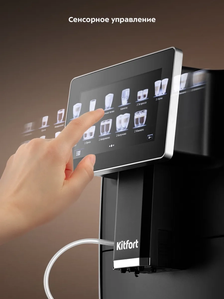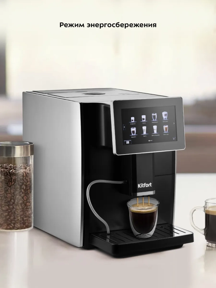 Кофемашина Китфорт KT-7373 позволяет настроить количество кофе, объем и температуру кофе, количество горячей воды для американо, а также время взбивания и подогревания молока. Также вы можете включить режим энергосбережения — через выбранное время, в течение которого кофемашина не будет использоваться, устройство отключится.