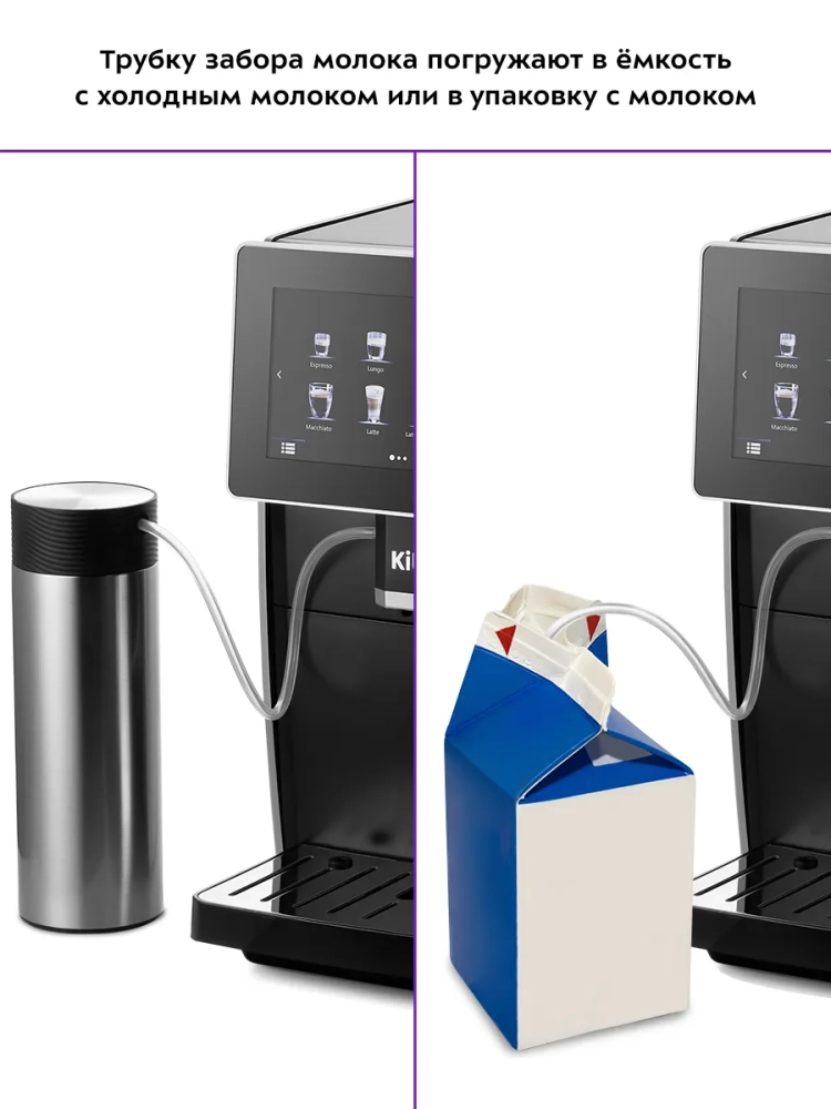 Молочную пенку для капучино кофемашина готовит автоматически и подает в чашку. Для этого предусмотрена трубка забора молока, которую погружают в емкость с холодным молоком.