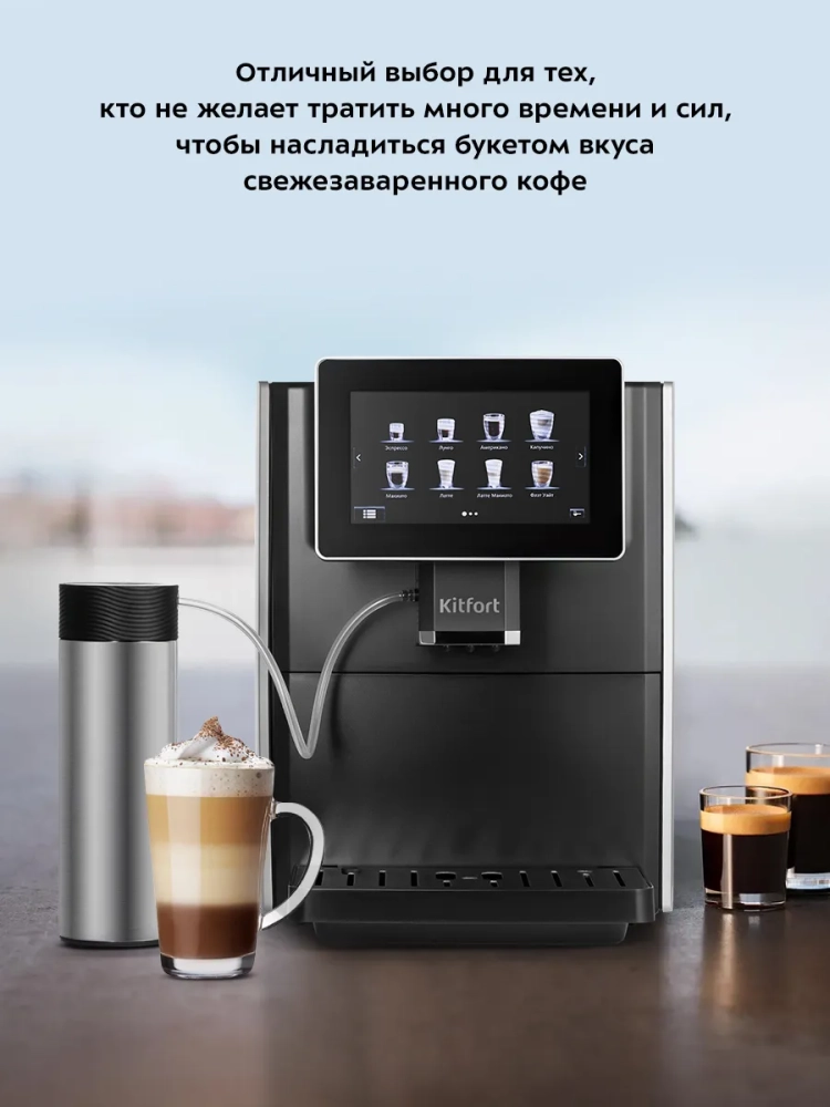 Автоматическая кофемашина Kitfort КТ-7373 — отличный выбор для гурманов, которые не желают тратить много времени и сил, чтобы насладиться полным букетом вкуса свежезаваренного кофе. Особая технология приготовления позволяет сохранить большое количество полезных веществ и тонкий аромат напитка. Кофемашина поможет приготовить кофе эспрессо, лунго, американо, капучино, латте, макиато, флэт уайт и латте макиато. С помощью кофемашины также можно приготовить молочную пенку, теплое молоко или включить подачу горячей воды.
