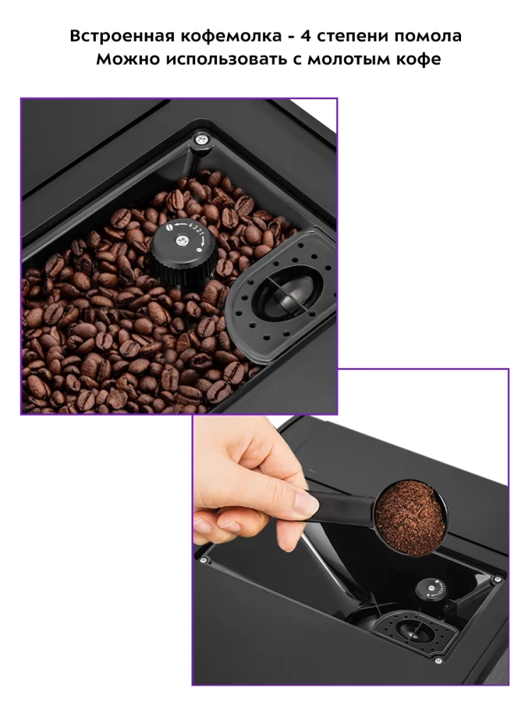 Встроенная кофемолка позволяет качественно измельчать кофейные зерна непосредственно перед приготовлением кофе, что положительно отражается на вкусе готового напитка. Кофемолка имеет металлические конические жернова, которые препятствуют излишнему перегреванию зерен при измельчении и позволяют получить равномерный помол. Кофемолка имеет 4 степени помола. Регулировка степени помола осуществляется путем изменения расстояния между жерновами. Также в кофемашине можно сварить кофе из уже молотого кофе. Хранение молотого кофе в устройстве не предусмотрено: в кофемашину засыпают молотый кофе для приготовления одной порции напитка.