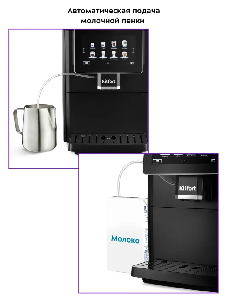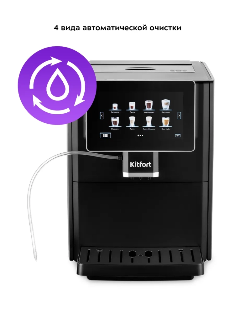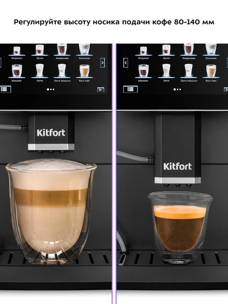Автоматическая кофемашина Kitfort КТ-7374 — отличный выбор для гурманов, которые не желают тратить много времени и сил, чтобы насладиться полным букетом вкуса свежезаваренного кофе. Особая технология приготовления позволяет сохранить большое количество полезных веществ и тонкий аромат напитка. Кофемашина поможет приготовить кофе эспрессо, лунго, американо, капучино, латте, макиато, флэт уайт и латте макиато. С помощью кофемашины также можно приготовить молочную пенку, теплое молоко или включить подачу горячей воды.