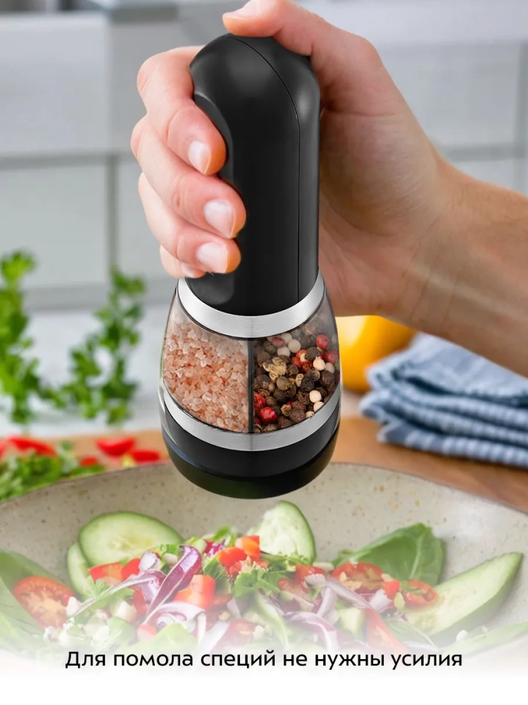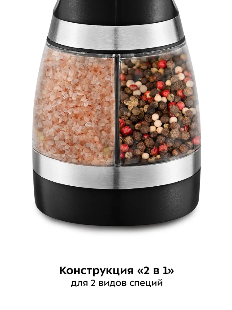 Устройство имеет конструкцию «2 в 1»: контейнер для специй разделен на две части для измельчения двух видов специй. Мельница выполнена из сочетания пластика и нержавеющей стали с прозрачным контейнером для специй, что позволит следить за количеством содержимого в нем.