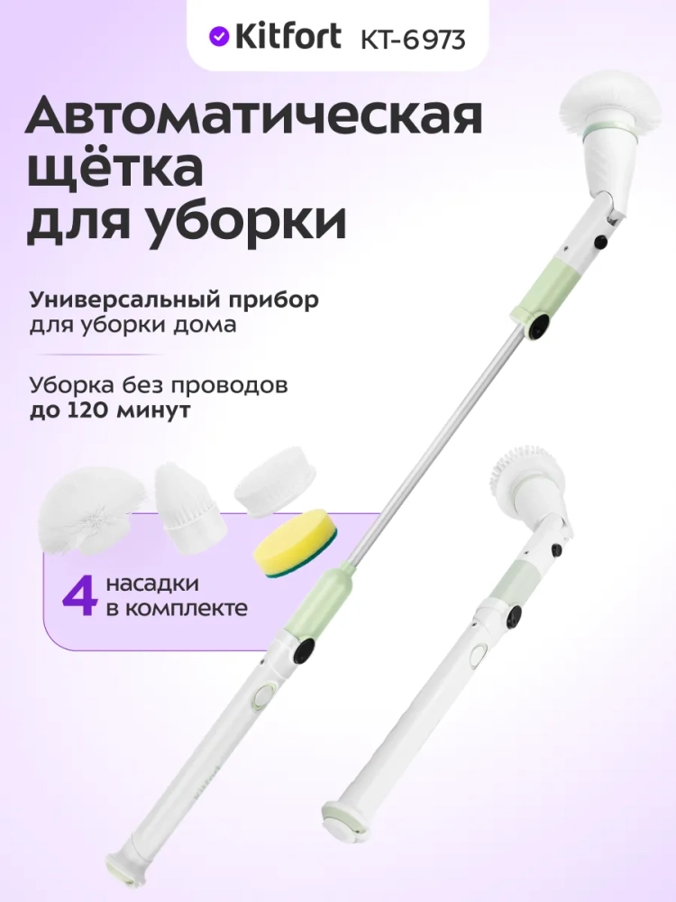 C помощью автоматической щетки Kitfort КТ-6973 для уборки вы можете очистить самые разные поверхности в доме или в автомобиле. При помощи специальных насадок из комплекта автоматическая щетка позволит вам без усилий очистить раковину и плиту на кухне, зеркала, окна, сантехнику, плитку, плинтуса и многое другое.