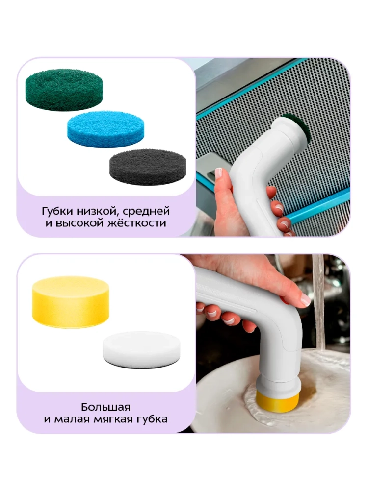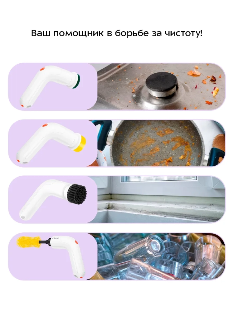 Электрощетка оснащена набором сменных насадок, что позволяет адаптировать её для уборки в самых разных местах. В комплект входят насадки для чистки раковины, вытяжки, мебели и даже окон. Щетка легко справляется с уборкой труднодоступных мест, таких как щели и углы, благодаря телескопической ручке, которая обеспечивает удобный доступ.