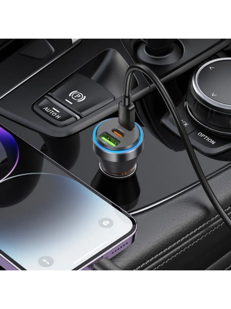 Автомобильное зарядное устройство с двумя Type-C и одним USB-A выходами.