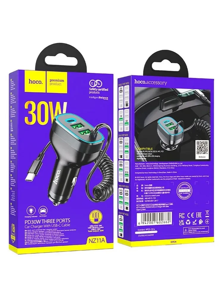 NZ11A Guide, автомобильное зарядное устройство со встроенным кабелем для Lightning, один порт Type-C 30 Вт и два порта USB-A 18 Вт, поддержка протоколов быстрой зарядки