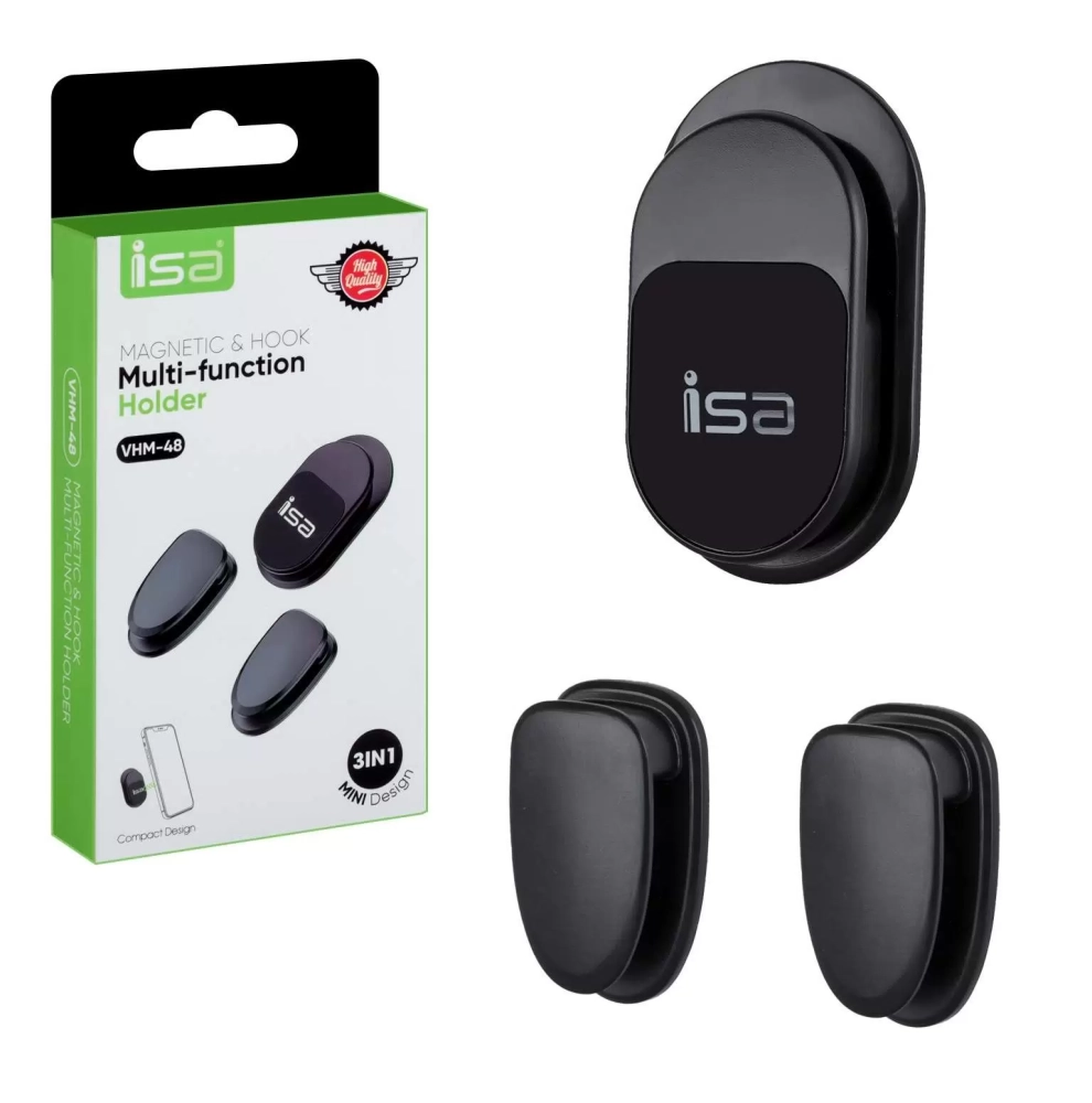 Автомобильный магнитный держатель для телефона ISA VHM-48 Компактный и удобный магнитный автодержатель ISA VHM-48 предназначен для надёжного крепления мобильного устройства в автомобиле, а также может использоваться дома или в офисе. Оснащён мощными неодимовыми магнитами и надёжной 3M-наклейкой для фиксации. Характеристики: • Модель: ISA VHM-48 • Тип: магнитный автодержатель • Материалы: ABS-пластик, силикон • Крепление: липкая основа 3M • Особенности: • Мощные неодимовые магниты для надёжного удержания • Универсальная совместимость с устройствами диагональю 4–6 дюймов • Не требует зажимов или механических фиксаторов • Возможна установка на любую гладкую поверхность в салоне автомобиля Комплектация: • Магнитный держатель • Металлическая пластина (для телефона или чехла) • Клеевая основа 3M для фиксации Преимущества: • Быстрая установка и снятие устройства одной рукой • Подходит для большинства смартфонов • Минималистичный и стильный дизайн • Можно использовать не только в машине, но и дома/в офисе