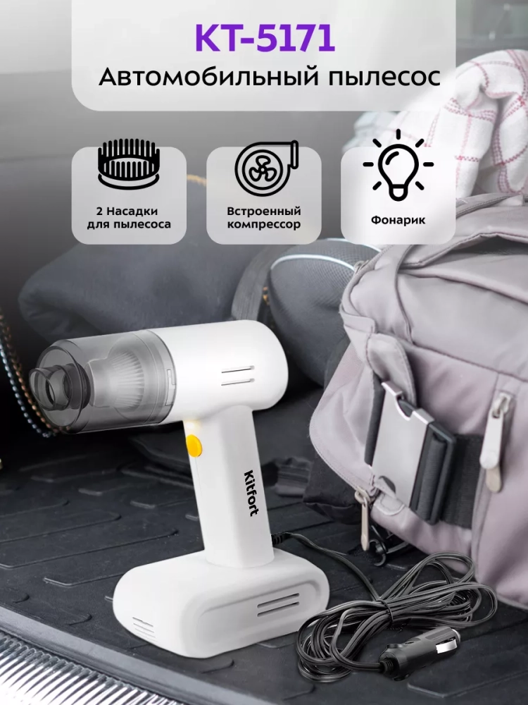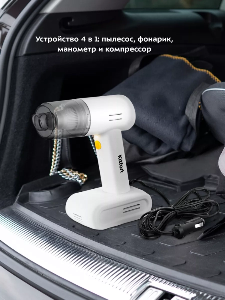 Автомобильный пылесос Kitfort КТ-5171 (4 в 1) сочетает в себе функции 4 устройств: пылесоса, который легко справится с пылью и мусором, фонарика, манометра для измерения давления в шинах и компрессора для накачки шин, мячей, надувных игрушек и матрасов.
