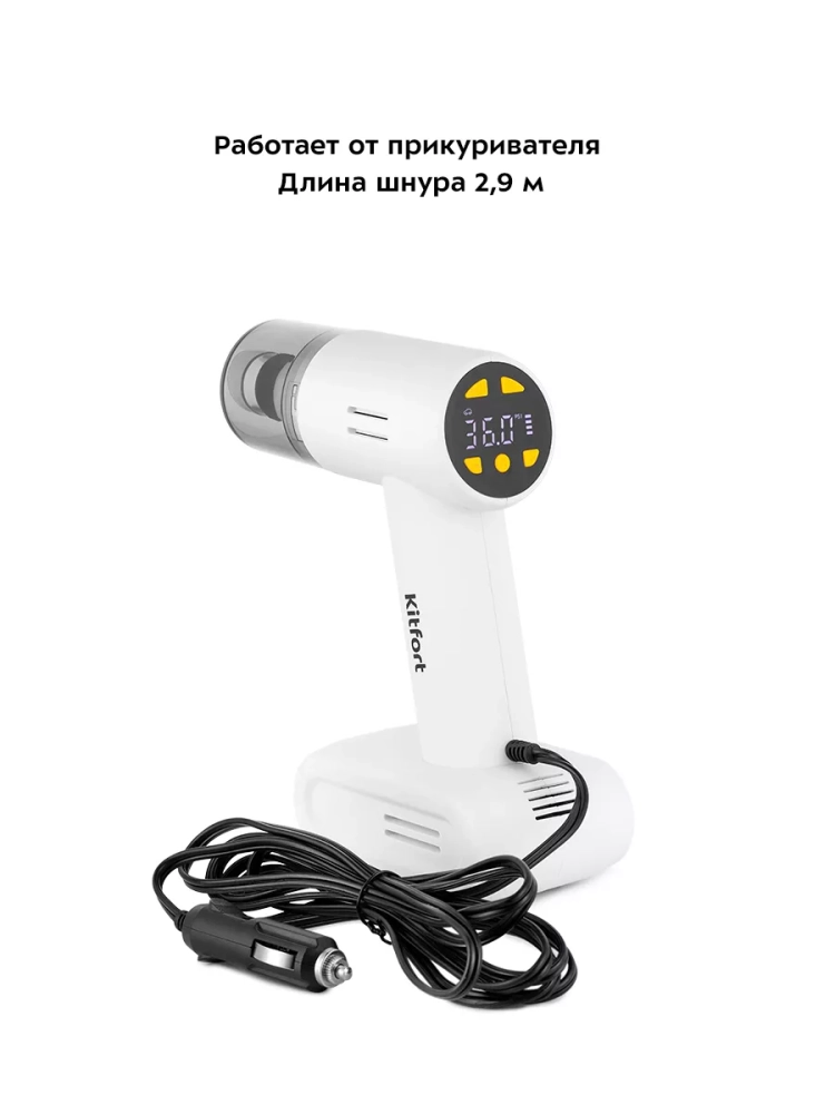 Прибор работает как от прикуривателя. Благодаря этому вы можете очистить салон автомобиля в дороге, проверить давление в шинах или накачать их. У пылесоса есть цифровой дисплей с кнопками, с помощью которых можно устанавливать целевое давление.