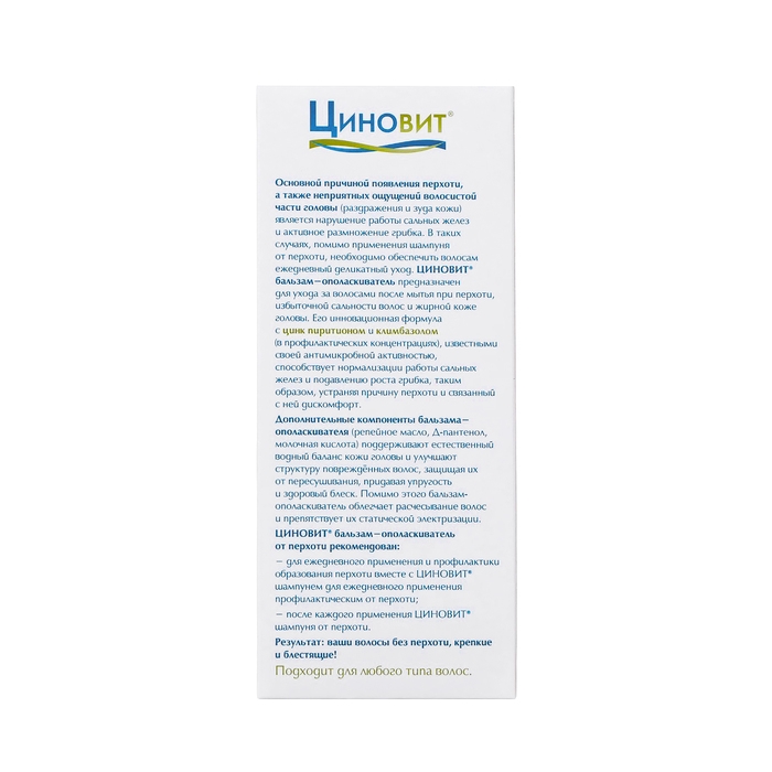 Основной причиной появления перхоти, а также неприятных ощущений волосистой части головы (раздражения и зуда кожи) является нарушение работы сальных желез (себорея) и активное размножение грибка. В таких случаях, помимо применения шампуня от перхоти, необходимо обеспечить волосам ежедневный деликатный уход. Циновит бальзам-ополаскиватель предназначен для ухода за волосами после мытья при перхоти, избыточной сальности волос и жирной коже головы. Он усиливает антимикробное действие шампуня от перхоти, успокаивает кожу головы и ухаживает за волосами.