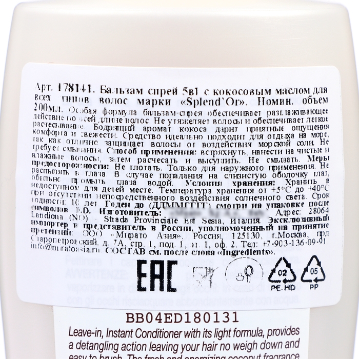 Бальзам-спрей 5 в1 SPLENDOR для всех типов волос с кокосовым маслом, 200 мл