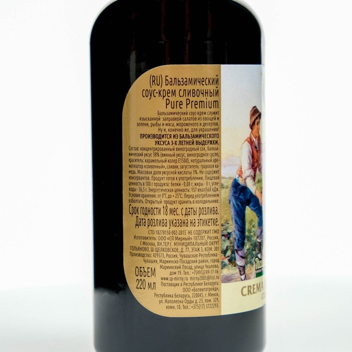 Состав: концентрированный виноградный сок, бальзамический уксус 38 % (винный уксус, виноградное сусло, краситель Е-150d) натуральный ароматизатор «Сливочный», сливки, загуститель конжаковая камедь Е425. Массовая доля уксусной кислоты 3 %. Не содержит консервантов.