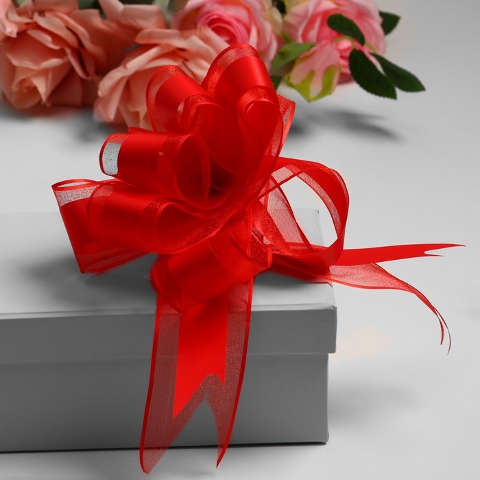 Для того чтобы собрать бант, надо потянуть за две ленточки, находящиеся между широкими лентами, удерживая широкие ленты в месте спайки.