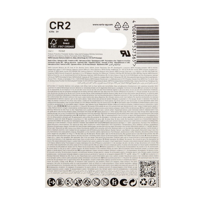 Батарейка литиевая Varta, CR2-1BL, 3В, блистер, 1 шт.