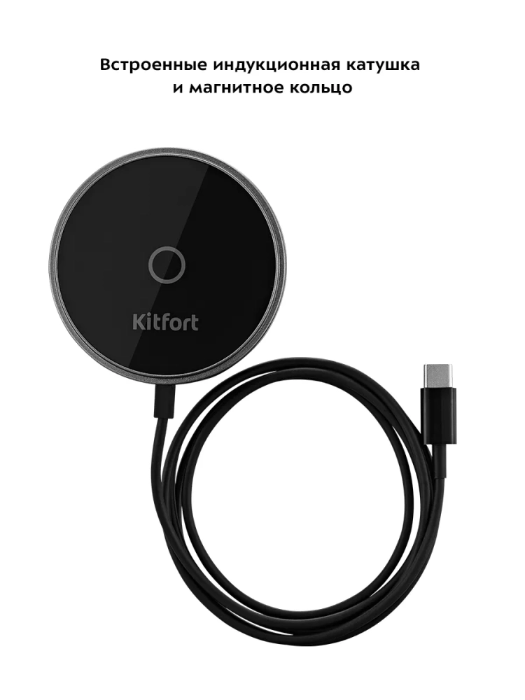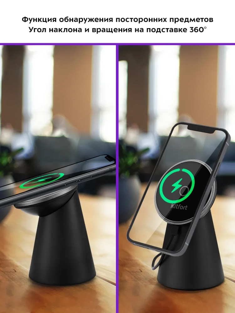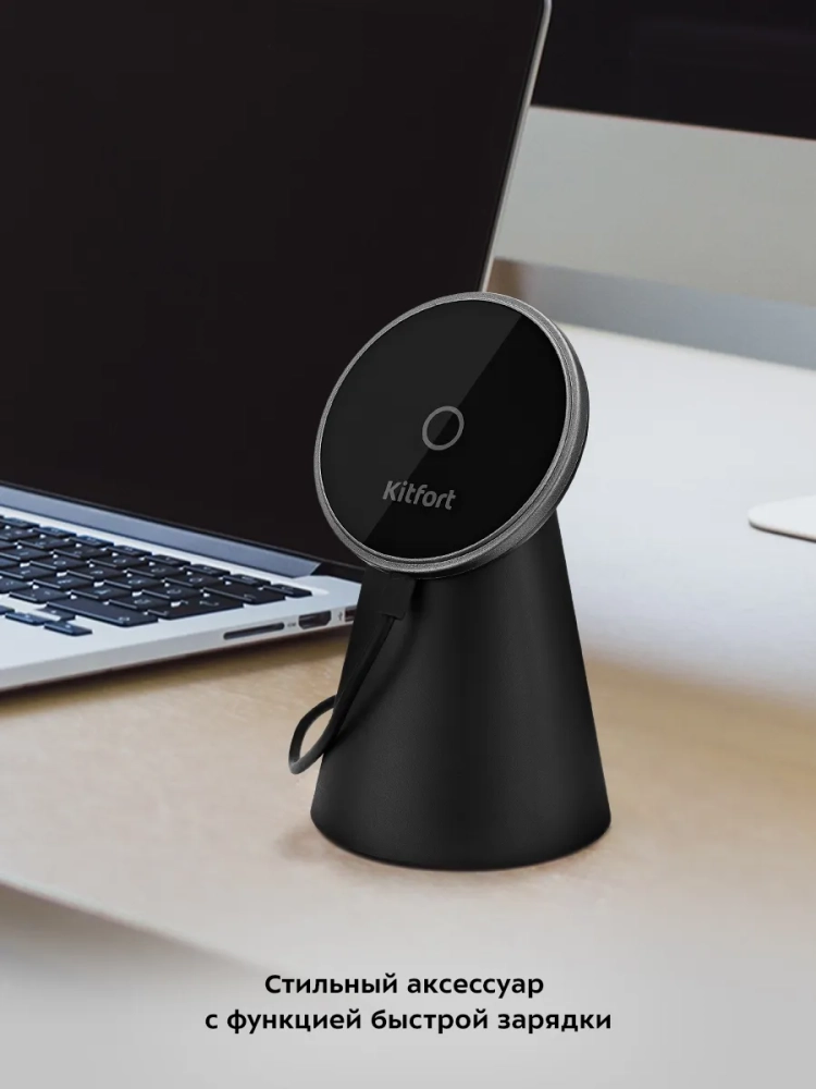Беспроводная зарядка Kitfort КТ-3369 позволяет с легкостью заряжать телефон, часы или другие устройства, если они поддерживают функцию беспроводной зарядки и имеют кольцевое магнитное крепление. Устройства без кольцевого магнитного устройства, но поддерживающие функцию беспроводной зарядки, также могут заряжаться от зарядки Китфорт KT-3369, но не будут крепиться к ней, поэтому располагать их надо горизонтально.