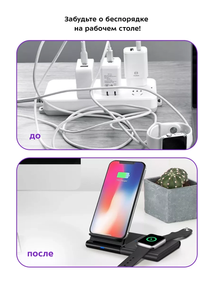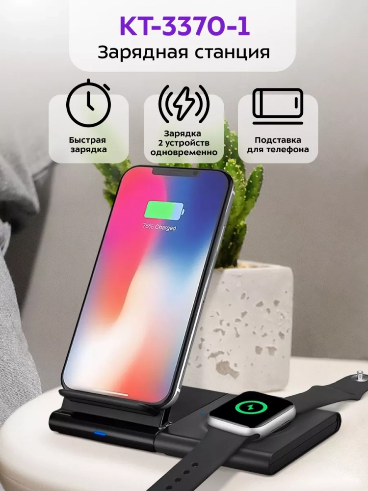 Зарядная станция Kitfort КТ-3370 позволяет с легкостью заряжать телефон, часы или другие устройства, если они поддерживают функцию беспроводной зарядки. Устройство работает по стандарту Qi для индукционной передачи энергии. Многие современные смартфоны и умные часы поддерживают стандарт беспроводной зарядки Qi.