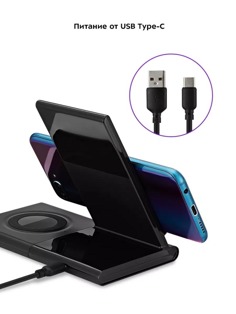 Зарядная станция KT-3370 поддерживает быструю зарядку, если подключить шнур USB Type-C (комплектный или рассчитанный на ток не менее 2 А) к блоку питания, который поддерживает технологию QC 2.0 (Quick Charge, быстрая зарядка). При использовании двух блоков, соединенных между собой, одновременно, только у блок с подставкой для телефона будет работать функция быстрой зарядки.