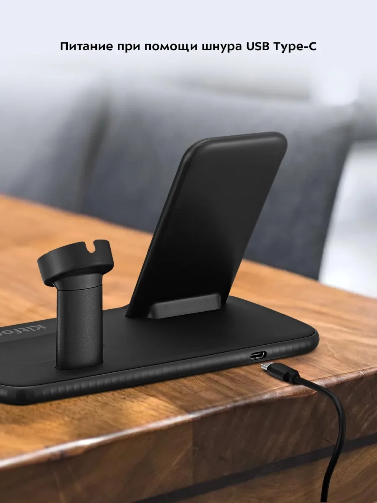 У зарядной станции Китфорт KT-3371 есть подставка для телефона, где можно расположить телефон как в вертикальном, так и в горизонтальном положении. Это очень удобно при использовании разных приложений или просмотре видео, если при этом телефон необходимо зарядить. На подставке для часов размещают часы, поддерживающие функцию беспроводной зарядки. А для зарядки наушников их кладут в область беспроводной зарядки наушников. Слева на корпусе есть USB-порт, поэтому вы можете использовать зарядную станцию и для проводной зарядки. Если ваши часы не поддерживают беспроводную зарядку, вы можете подключить шнур для зарядки часов к USB-порту зарядной станции, а часы разместить на подставке для часов. Однако некоторые модели часов могут не подходить по форме и потому плохо удерживаться на подставке.