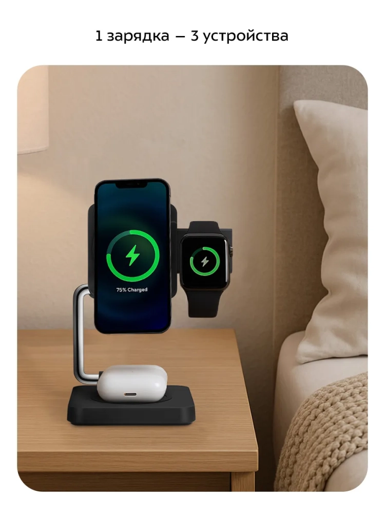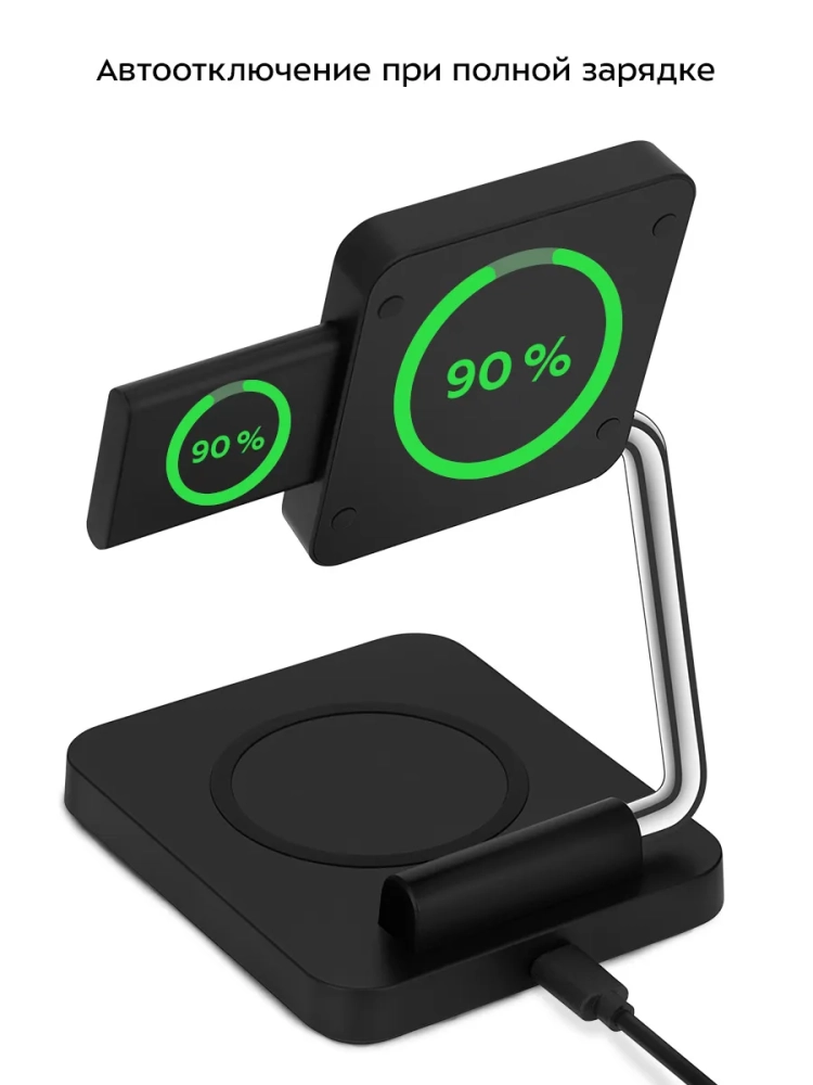 Магнитная конструкция станции обеспечивает надежную фиксацию устройств во время зарядки, а настольная установка позволяет удобно разместить станцию на рабочем столе или тумбочке. Время зарядки сокращается благодаря поддержке технологии быстрой зарядки, что позволяет за короткий промежуток времени полностью зарядить устройства. Станция также поддерживает зарядку через блок питания, что делает ее еще более гибкой в использовании.