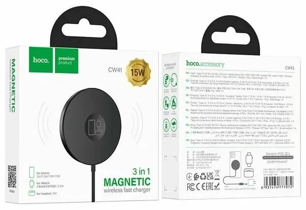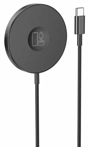 CW41 - это беспроводное зарядное устройство от бренда hoco со встроенным кабелем, имеющим штекер Type-C. Отличительными особенностями данной модели являются: компактный размер, мощный заряд, встроенный магнит c поддержкой MagSafe. Стильный современный дизайн девайса впишется в любой интерьер.