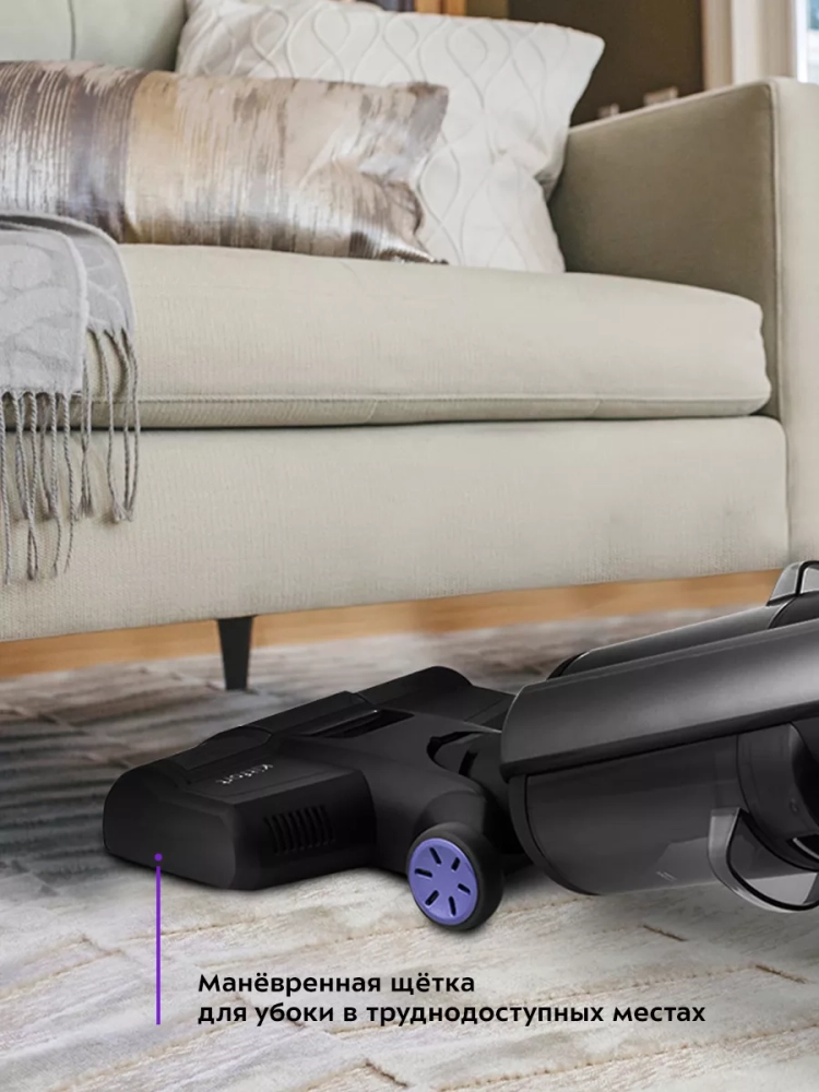 Одно из главных достоинств вертикального пылесоса — это компактность. При хранении он занимает мало места, а во время работы пылесос благодаря своей маневренности может легко вписаться в узкий коридор или комнату, заполненную различными предметами. Хранить пылесос можно на базе, через которую он заряжается.