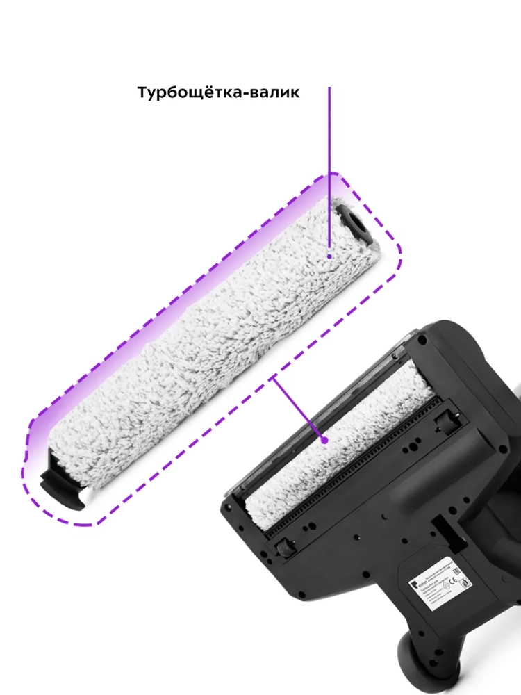 Пылесос комплектуется турбощеткой-валиком, покрытой специальной микрофиброй, которая качественно впитывает воду и очищает гладкие поверхности полов. Ковровые покрытия также можно помыть, приложив усилие.
