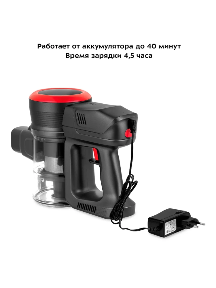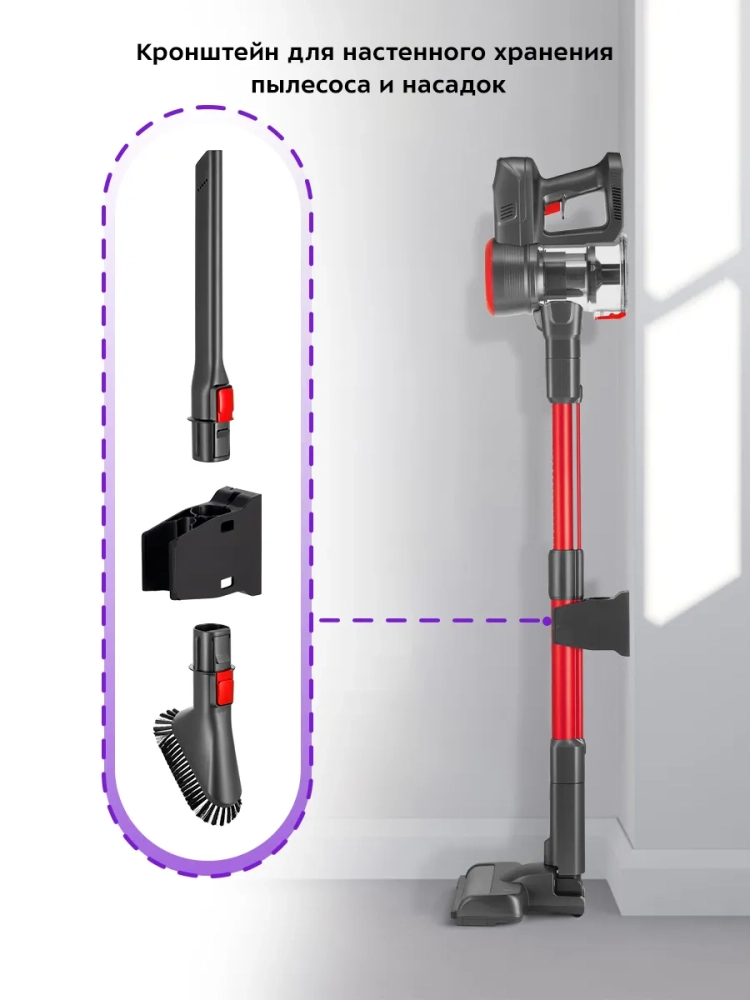 Пылесос имеет функцию вертикальной парковки — он может стоять вертикально, не опираясь на стену или другой предмет. Также пылесос можно повесить на стену с помощью кронштейна и крепежей, идущих в комплекте.
