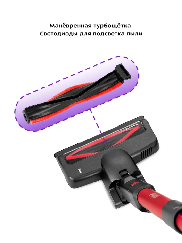 Пылесос комплектуется щеткой для пола с турбощеткой, которая качественно очищает гладкие поверхности и ковровые покрытия с коротким ворсом. Светодиодная подсветка на щетке для пола позволяет увидеть пыль и мусор в плохо освещенных зонах, например, под кроватью или диваном. Также к пылесосу прилагаются ворсовая щетка и узкая насадка, мини-щетка с турбощеткой.