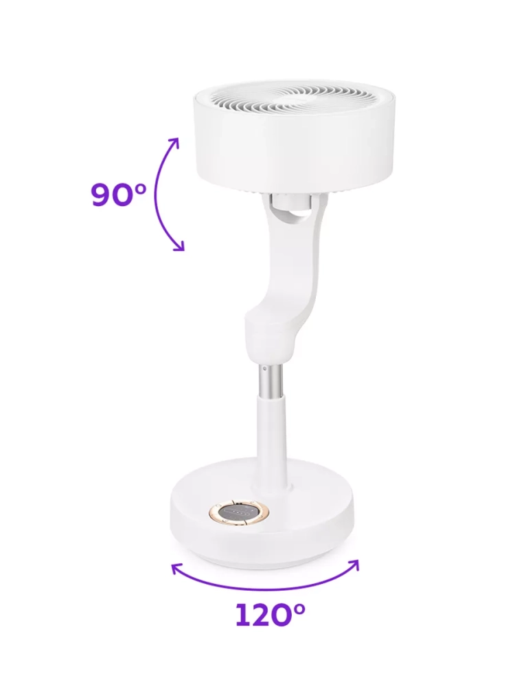 Функция автоматического вращения в горизонтальной плоскости позволит охватить большее пространство для обдува. Вентилятор может вращаться по горизонтали на 120°. Вы также можете установить вручную удобный угол наклона оголовья — оно поворачивается вверх и вниз на 90°.