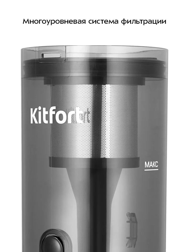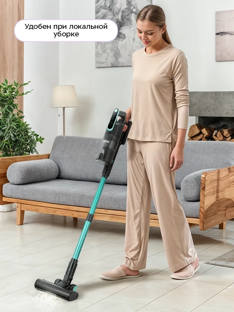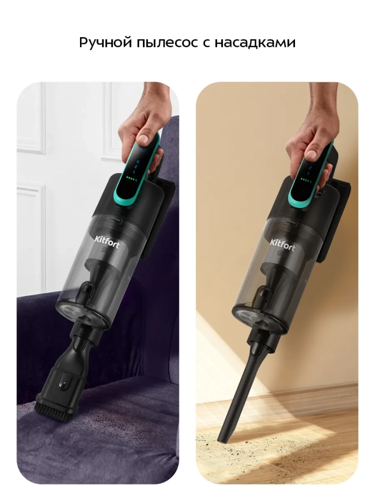 Беспроводной вертикальный пылесос Kitfort КТ-5568 очень удобен при локальной уборке. Он компактен, всегда под рукой и готов к работе. При отсоединении удлинительной трубки и установке насадки он превращается в ручной пылесос. Его конструкция позволяет легко проникать в самые труднодоступные уголки квартиры. При этом не нужно передвигать громоздкий корпус проводного пылесоса и управляться с непослушным шлангом. Благодаря работе от аккумулятора не нужно включать вилку в розетку, провода не мешают под ногами, поэтому пылесос имеет неограниченный радиус действия: от любого уголка квартиры до машины или беседки в саду. Пылесос оснащен маневренной напольной турбощеткой, которая вращается в двух плоскостях.