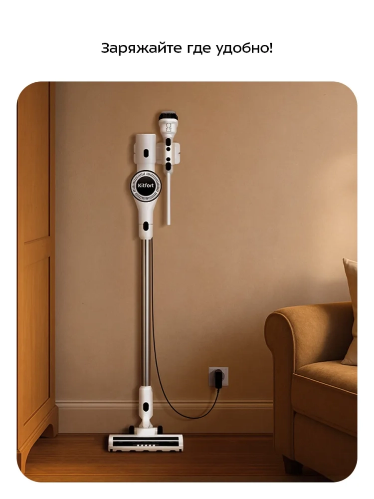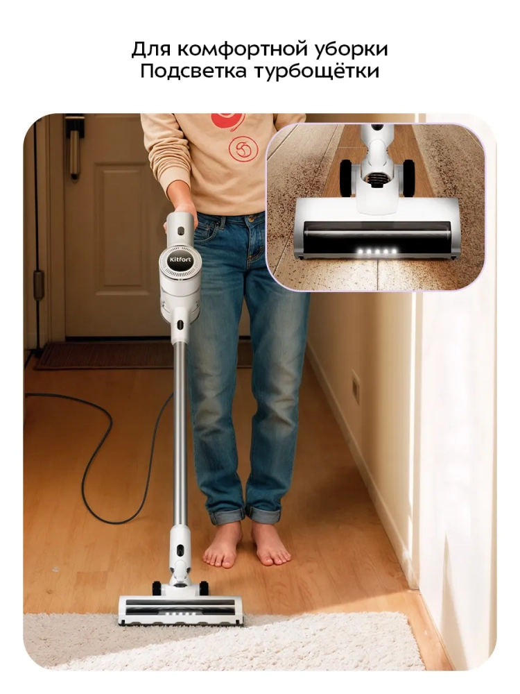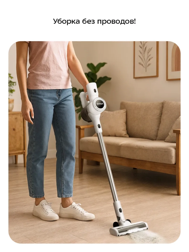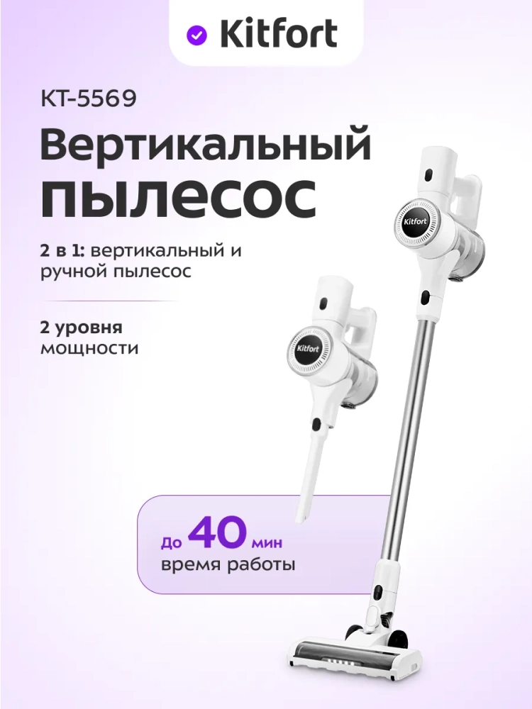 Беспроводной вертикальный пылесос Kitfort КТ-5569 очень удобен при локальной уборке. Он компактен, всегда под рукой и готов к работе. При отсоединении удлинительной трубки и установке насадки он превращается в ручной пылесос. Его конструкция позволяет легко проникать в самые труднодоступные уголки квартиры. При этом не нужно передвигать громоздкий корпус проводного пылесоса и управляться с непослушным шлангом. Благодаря работе от аккумулятора не нужно включать вилку в розетку, провода не мешают под ногами. Поэтому пылесос имеет неограниченный радиус действия: от любого уголка квартиры до машины или беседки в саду. Пылесос оснащен маневренной напольной турбощеткой, которая вращается в двух плоскостях.