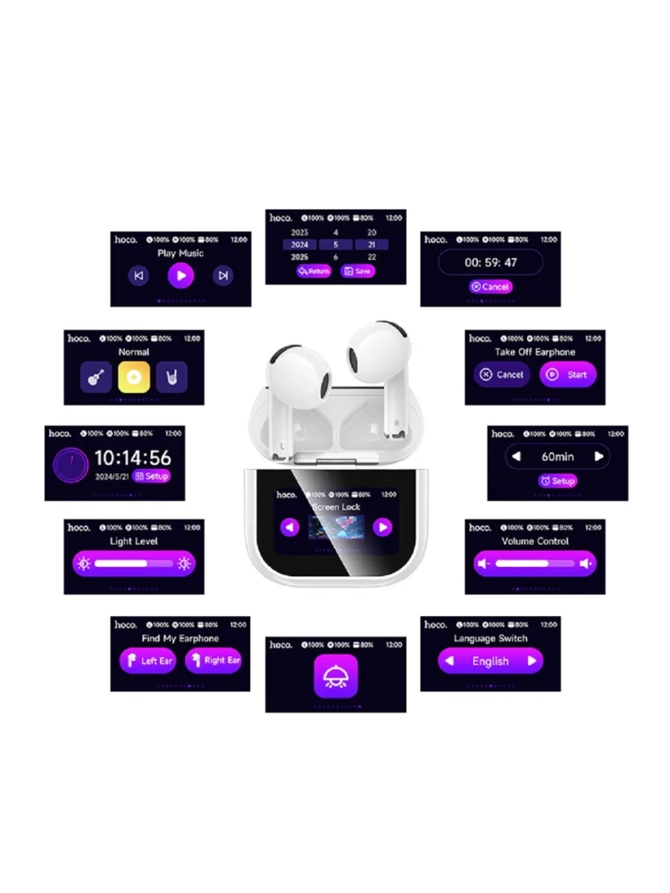 Гарнитура оснащена интеллектуальным сенсорным экраном со светодиодной подсветкой, который позволяет управлять несколькими настройками функций непосредственно из чехла для зарядки