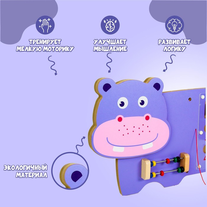 У логической доски множество поверхностей с разными играми в зависимости от модели. Есть крутящиеся кубики, лабиринт, серпантинка и шестерёнки, поверхность со вкладышами, сортер, счёты или музыкальные инструменты. А ещё он выполнен в виде дружелюбного персонажа, поэтому обязательно понравится ребёнку.