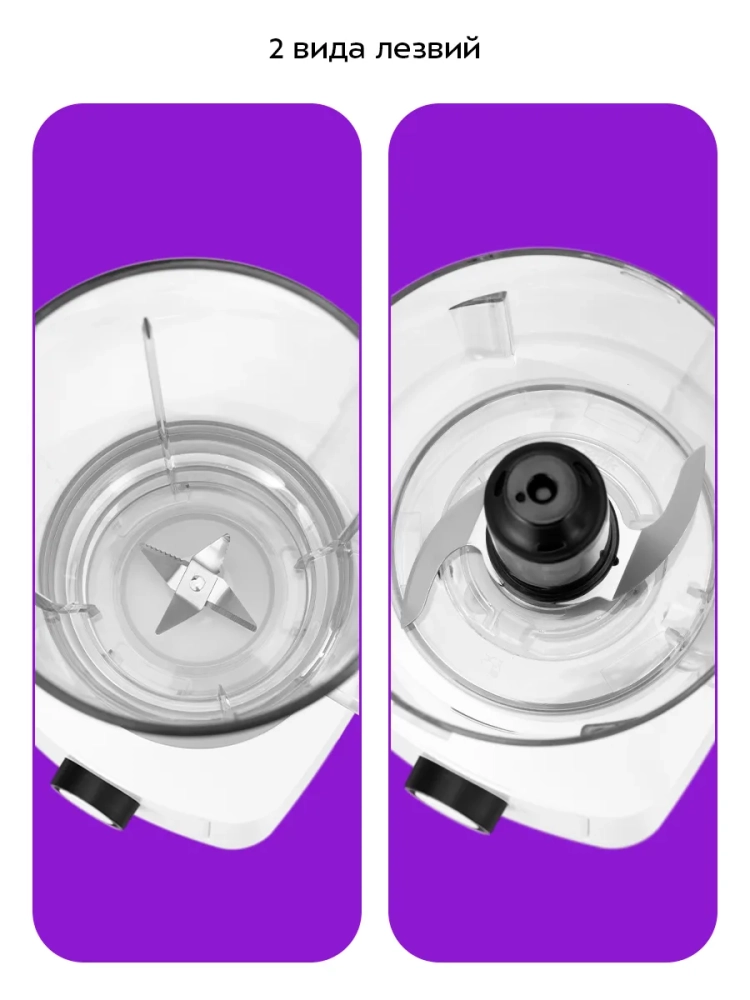 Чаши блендера и измельчителя выполнены из пластика, их прозрачные стенки позволяют наблюдать за процессом и контролировать степень измельчения. Ножи блендера и измельчителя сделаны из нержавеющей стали. Они являются съемными, что упрощает уход за прибором.