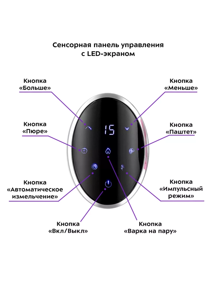 Управление прибором осуществляется с помощью сенсорной панели. Также у прибора есть дисплей, на котором отображается время варки продуктов. Время варки при желании можно увеличить или уменьшить. После варки на пару продукты можно автоматически измельчить. Есть и импульсный режим, в котором блендер работает, пока вы удерживаете кнопку.