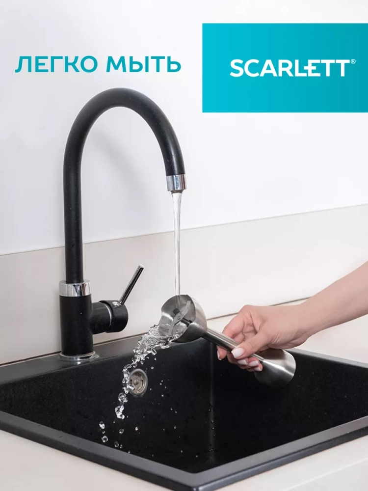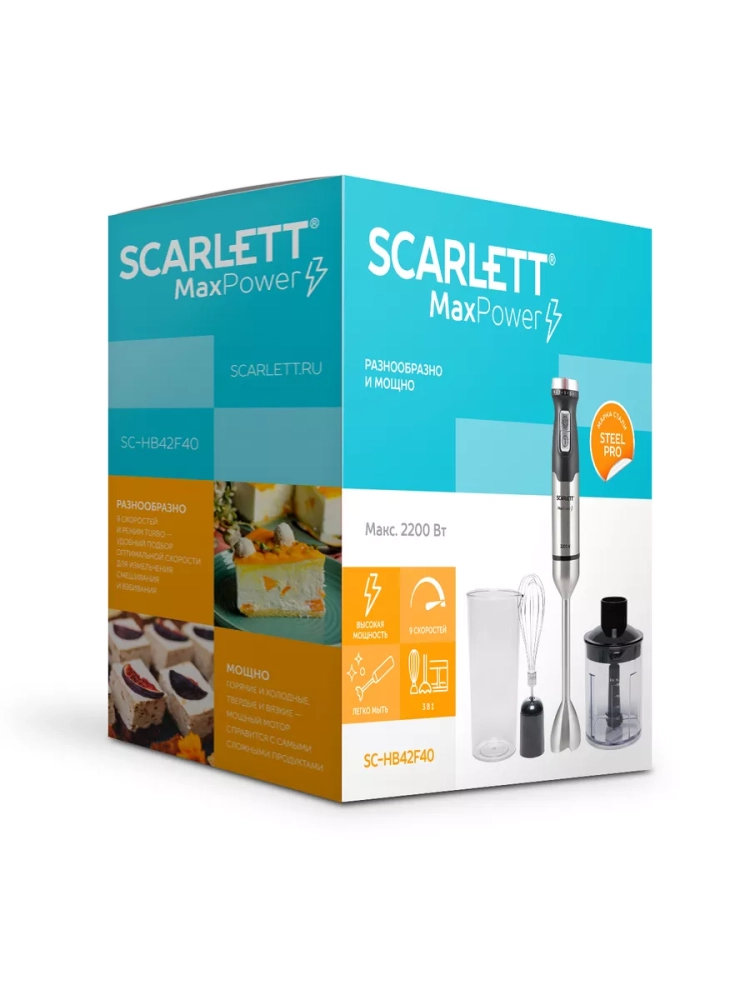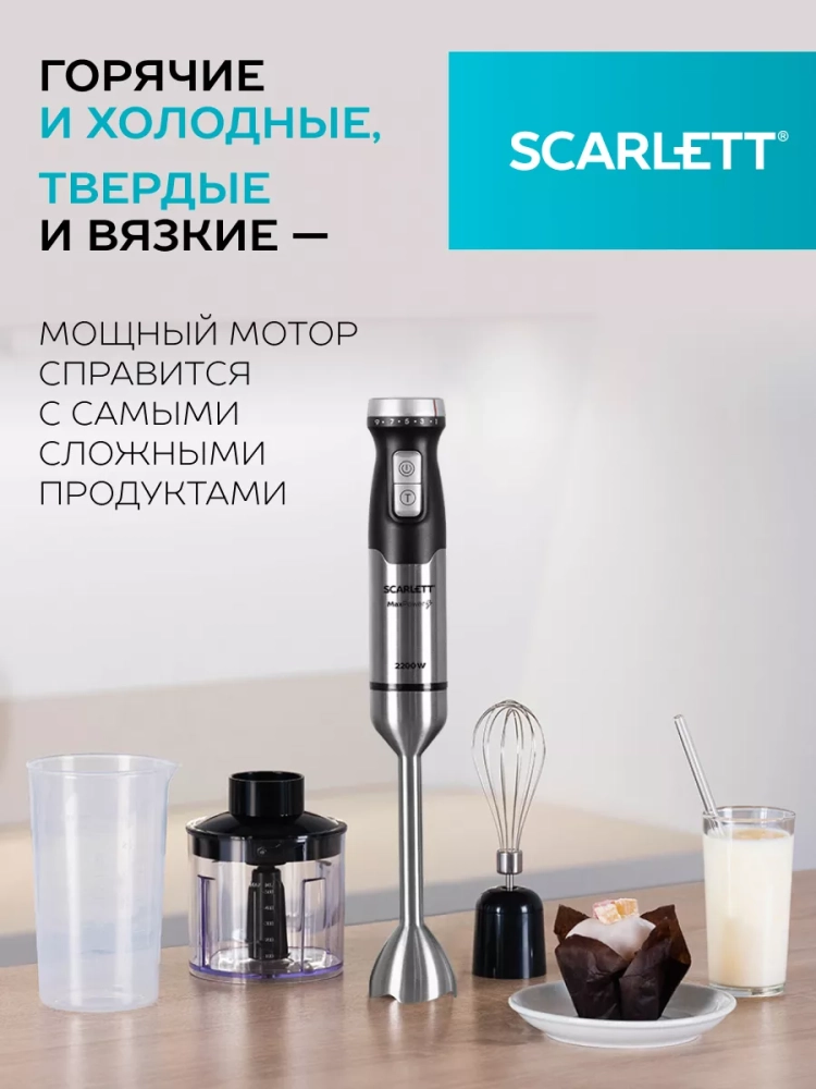 Scarlett SC-HB42F40 – погружной блендер 3 в 1, подходит для измельчения, взбивания и смешивания.
