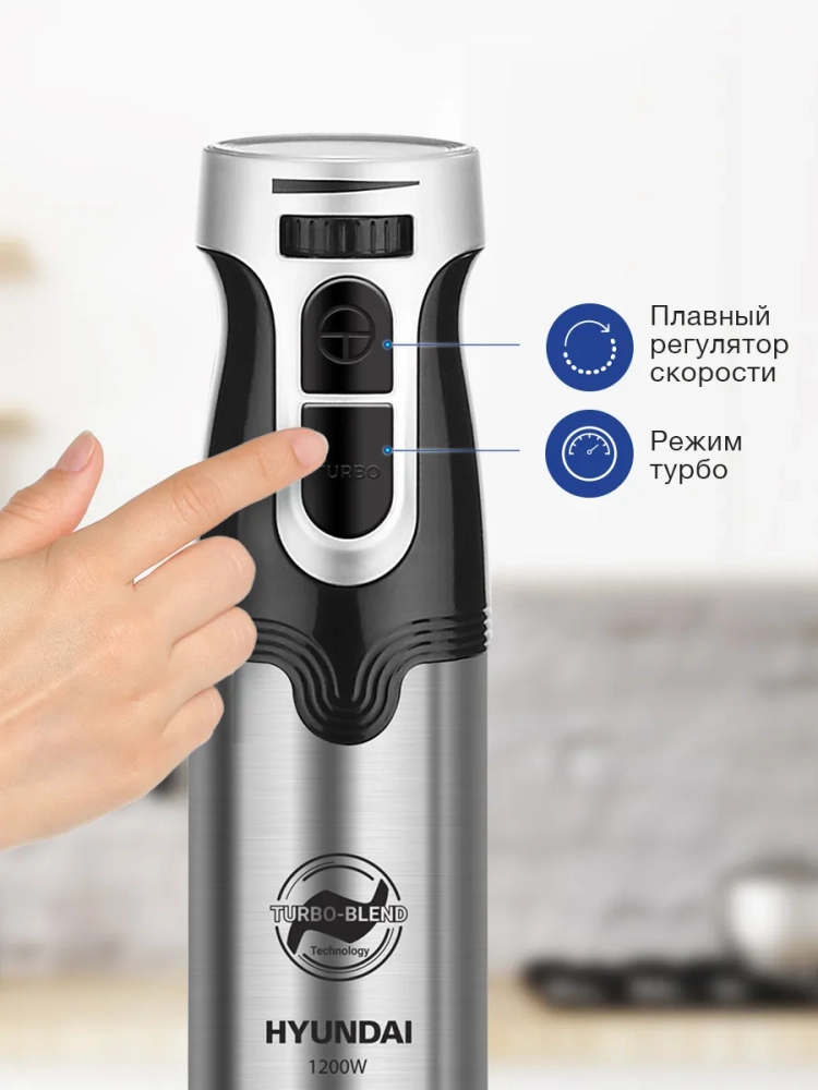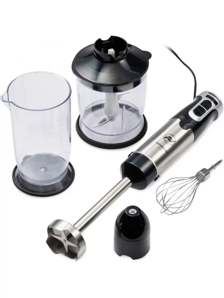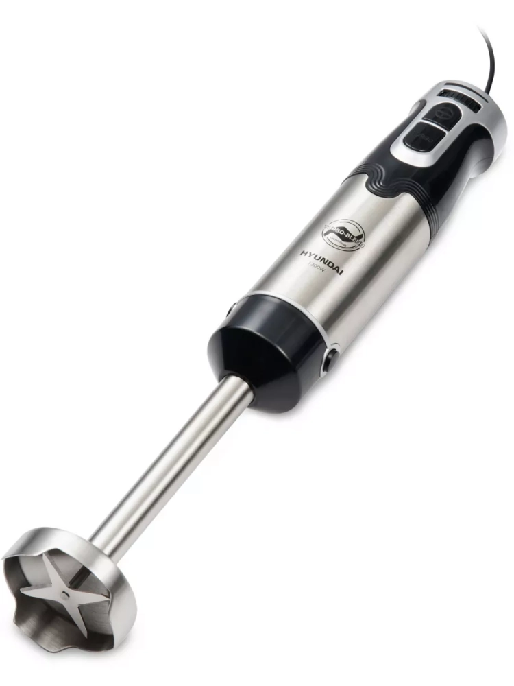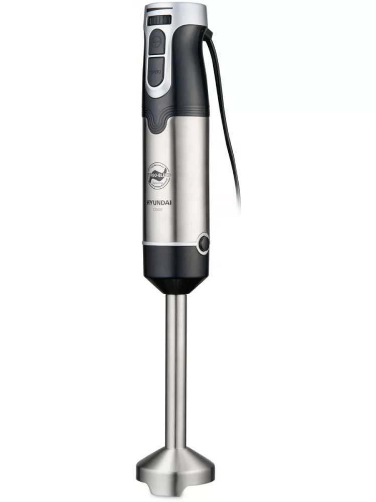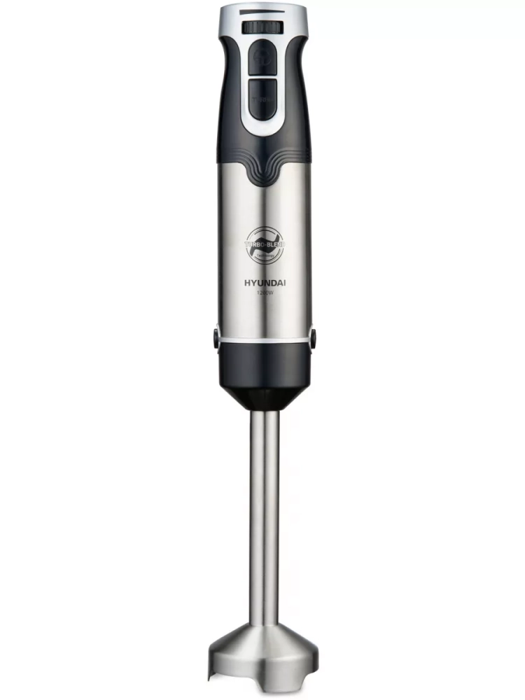 Блендер погружной Hyundai HYB-H3935 черный/серебристый, мощность 1200Вт, материал погружной части нержавеющая сталь, плавная регулировка скорости; низкий уровень шума, объём измельчителя = 500 мл; объём мерного стакана = 700 мл.