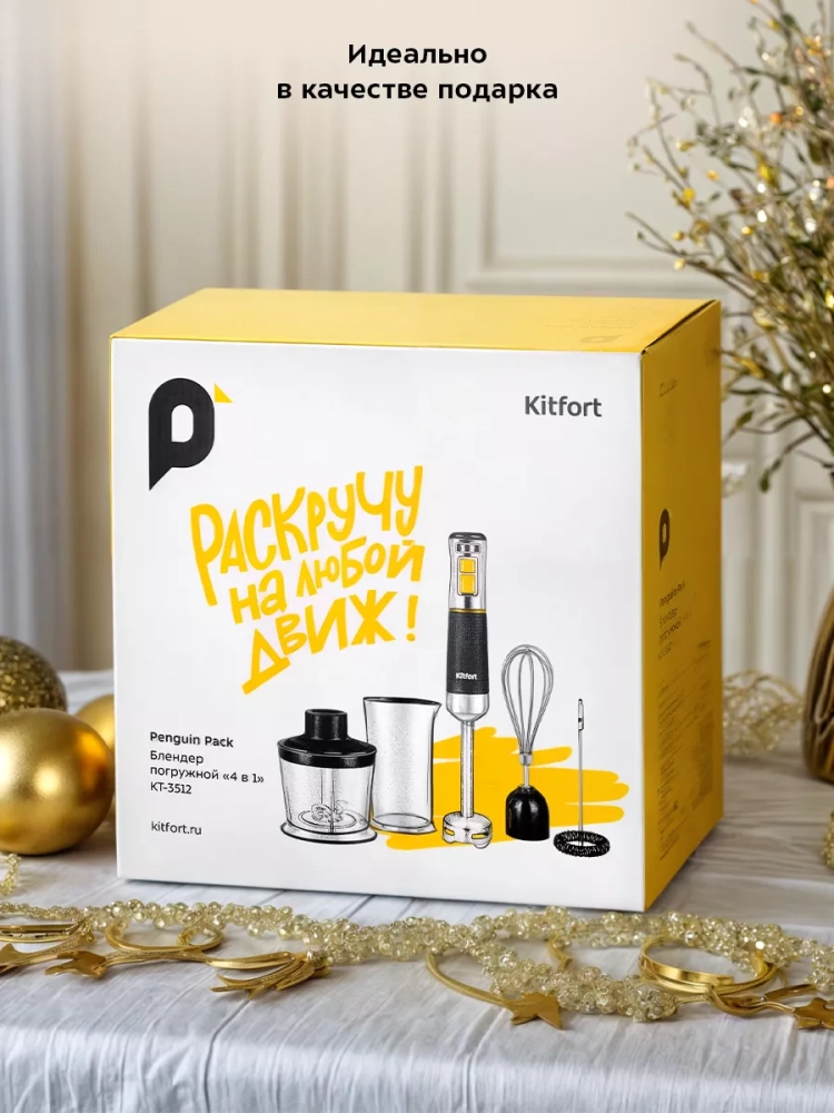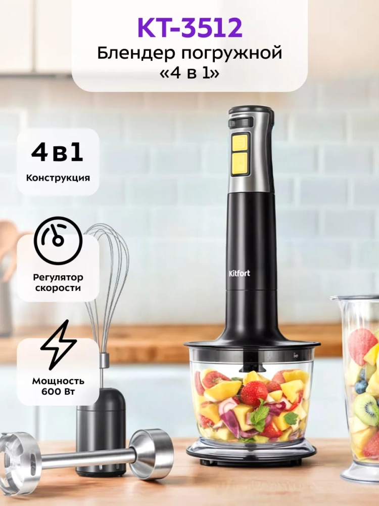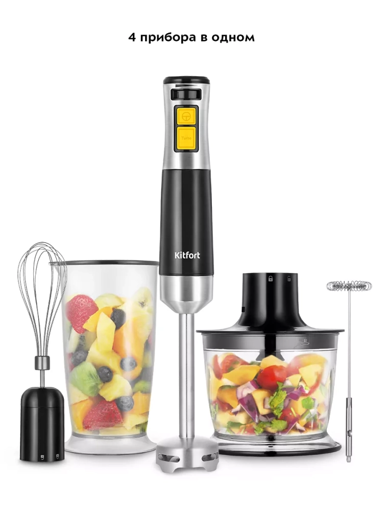 Погружной блендер «4 в 1» Kitfort КТ-3512 — универсальное кухонное устройство, с которым вы сможете приготовить множество блюд для себя, своих родных и друзей. Устройство предназначено для смешивания, взбивания, гомогенизации, приготовления фруктовых и фитнес-напитков, супов-пюре, соусов, муссов, молочных коктейлей, детского питания, а также для замеса жидкого теста.