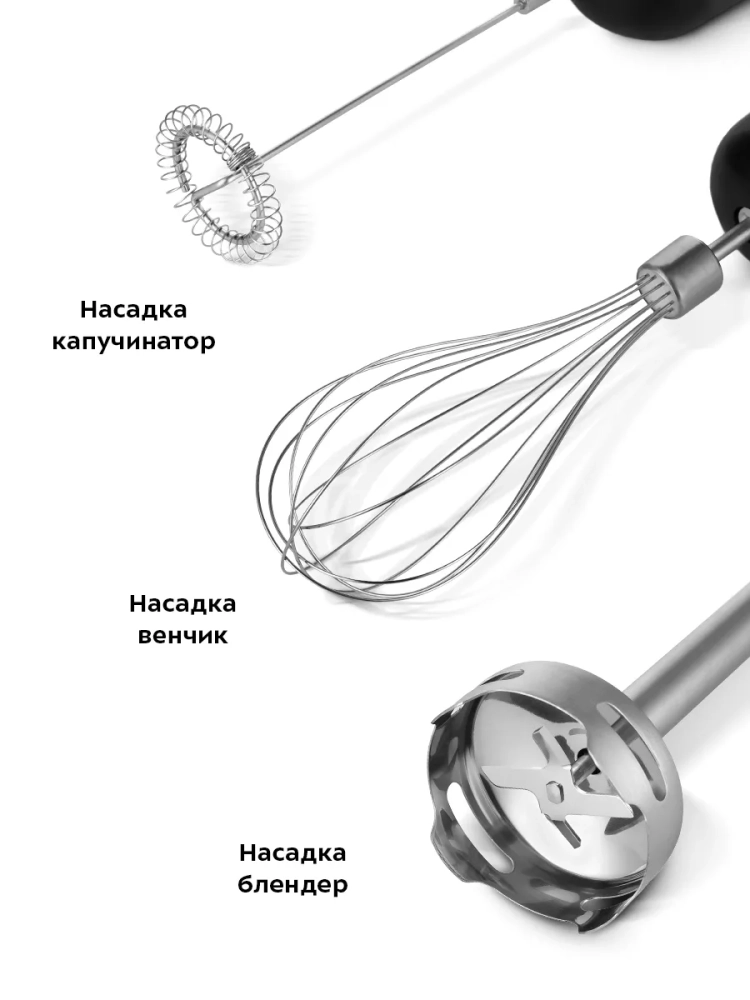 Прибор оснащен тремя насадками и чашей измельчителя емкостью 500 мл, благодаря которым устройство может использоваться разными способами: насадка-блендер измельчает и смешивает ингредиенты в однородную консистенцию, насадка-венчик предназначена для приготовления жидкого теста и взбивания яичных белков, насадка-капучинатор предназначена для создания молочной пенки для кофейных напитков, а в чаше измельчителя можно быстро измельчить мясо, сыр, овощи или ягоды.