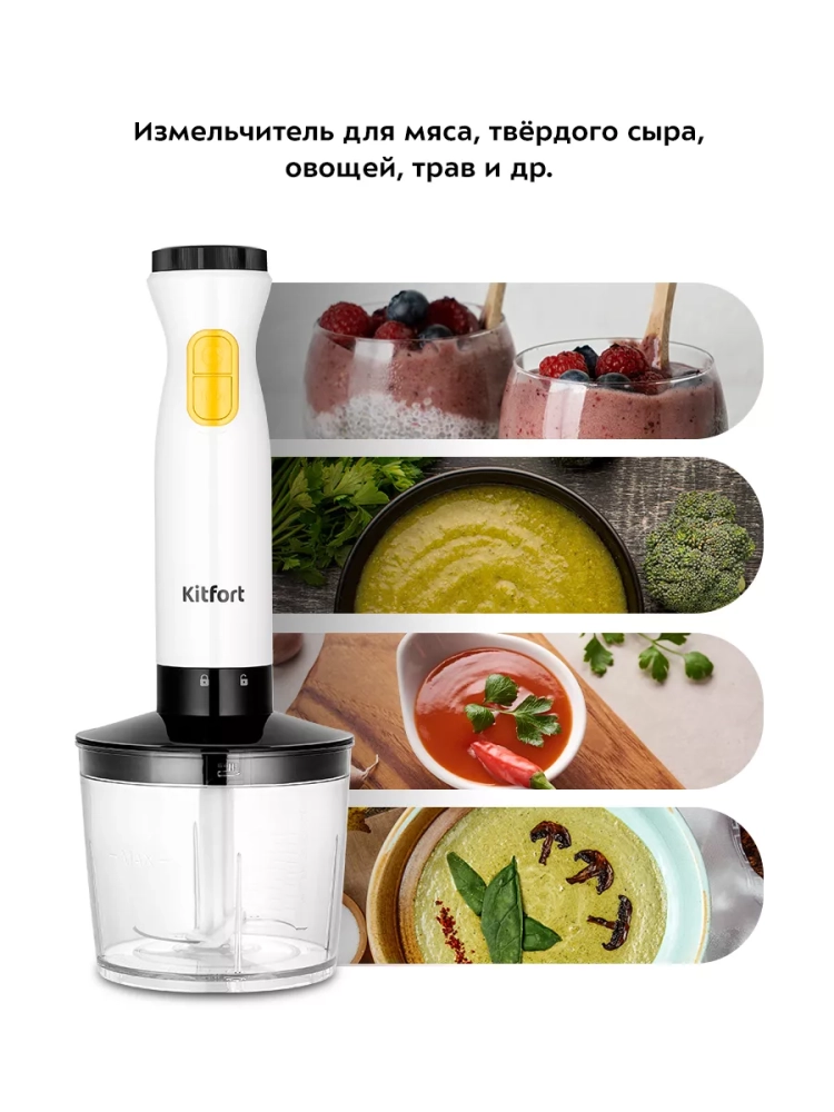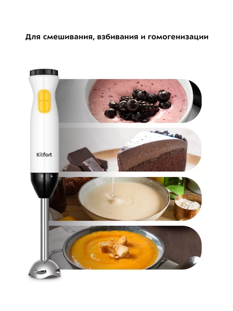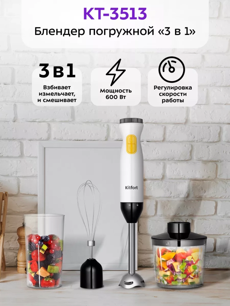 Погружной блендер «3 в 1» Kitfort КТ-3513 — универсальное кухонное устройство, с которым вы сможете приготовить множество блюд для себя, своих родных и друзей. Устройство предназначено для смешивания, взбивания, гомогенизации, приготовления фруктовых и фитнес-напитков, супов-пюре, соусов, муссов, молочных коктейлей, детского питания, а также для замеса жидкого теста.