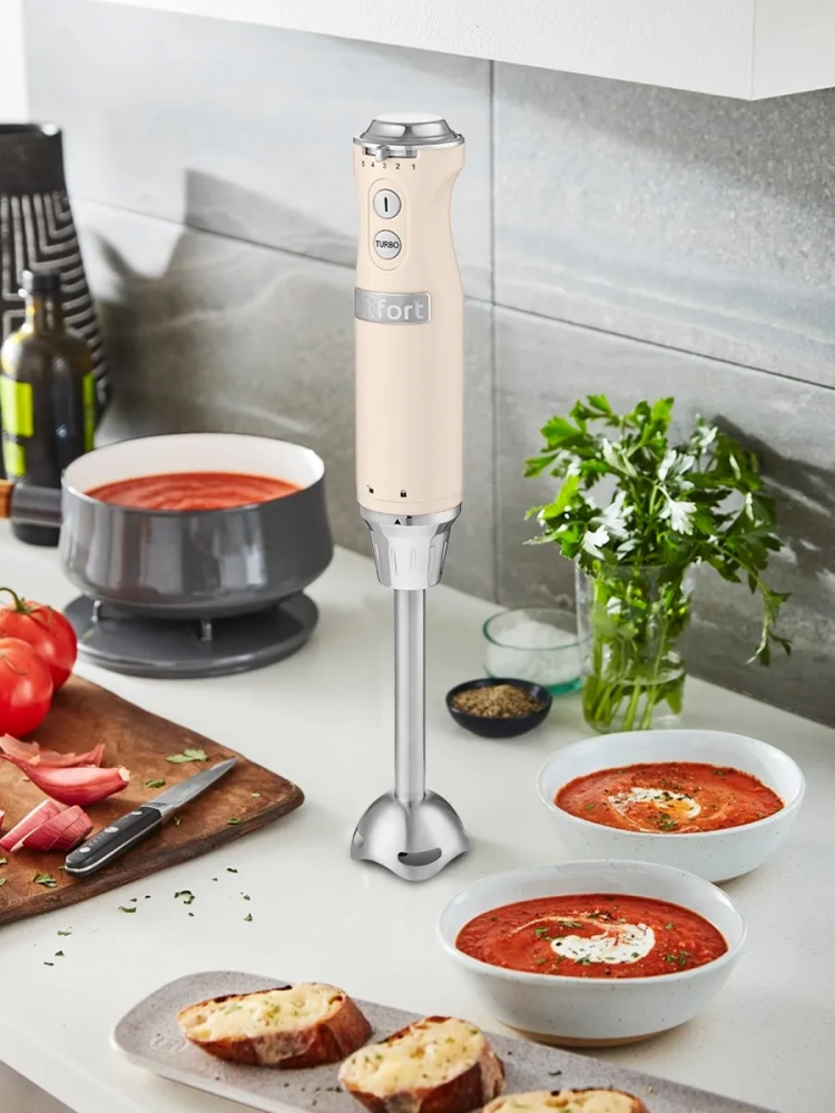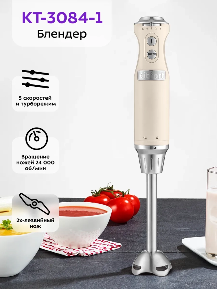 Погружной блендер Kitfort КТ-3084 предназначен для смешивания, взбивания, гомогенизации, приготовления фруктовых и фитнес-напитков, супов-пюре, соусов, муссов, молочных коктейлей, детского питания, а также для замеса жидкого теста. Блендер оснащен пятью скоростями работы с турборежимом и надежным двигателем, рассчитанным на длительный срок эксплуатации. Нож блендера выполнен из нержавеющей стали, что обеспечивает долгий срок службы. Насадка-блендер легко снимается с моторного блока, поэтому уход за устройством не составит труда. Благодаря компактным размерам погружной блендер KT-3084 не займет много места на вашей кухне. Устройство очень удобно в использовании - достаточно погрузить насадку-блендер в емкость с ингредиентами и нажать на нужную кнопку скорости. Блендер поможет смешать ингредиенты как для маленькой кружки смузи, так и для большой кастрюли крем-супа. Использование погружного блендера позволяет непрерывно наблюдать за процессом приготовления, благодаря чему вы всегда будете знать, в какой момент остановить смешивание для достижения желаемой консистенции блюда или напитка.