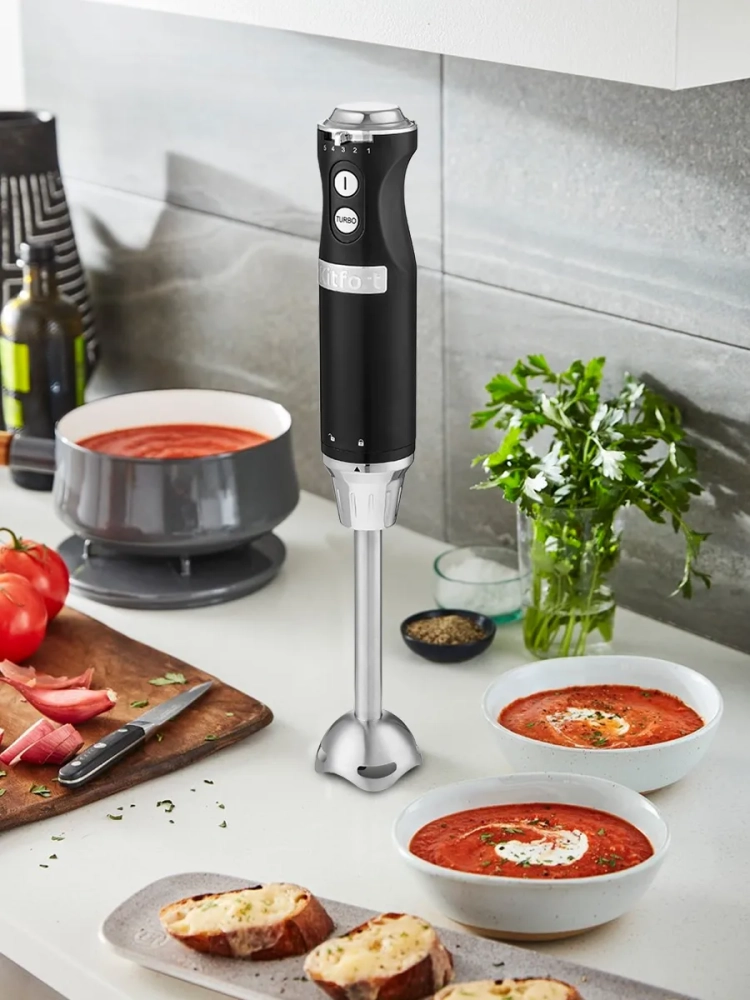 Погружной блендер Kitfort КТ-3084 предназначен для смешивания, взбивания, гомогенизации, приготовления фруктовых и фитнес-напитков, супов-пюре, соусов, муссов, молочных коктейлей, детского питания, а также для замеса жидкого теста. Блендер оснащен пятью скоростями работы с турборежимом и надежным двигателем, рассчитанным на длительный срок эксплуатации. Нож блендера выполнен из нержавеющей стали, что обеспечивает долгий срок службы. Насадка-блендер легко снимается с моторного блока, поэтому уход за устройством не составит труда. Благодаря компактным размерам погружной блендер KT-3084 не займет много места на вашей кухне. Устройство очень удобно в использовании - достаточно погрузить насадку-блендер в емкость с ингредиентами и нажать на нужную кнопку скорости. Блендер поможет смешать ингредиенты как для маленькой кружки смузи, так и для большой кастрюли крем-супа. Использование погружного блендера позволяет непрерывно наблюдать за процессом приготовления, благодаря чему вы всегда будете знать, в какой момент остановить смешивание для достижения желаемой консистенции блюда или напитка.