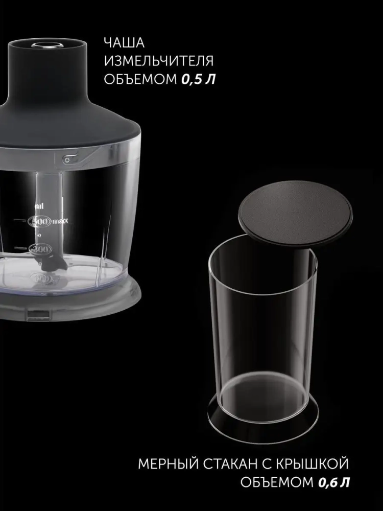 Практичность: Насадки блендера и венчик из нержавеющей стали, чаша измельчителя объемом 0,5 л и мерный стакан объемом 0,6 л легко моются и долговечны.