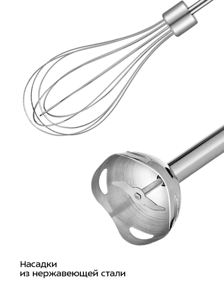 Погружной блендер идеально подходит для приготовления смузи, супов-пюре, соусов, муссов, молочных коктейлей и детского питания. Он также справляется с замесом жидкого теста, что делает его универсальным инструментом для любой кухни. В комплекте идет венчик, который позволяет взбивать сливки, яичные белки и готовить бисквиты и десерты из готовых смесей.