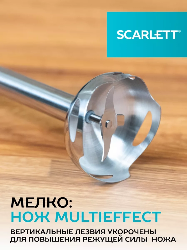 «Нога» блендера оснащена ножом MULTIEFFECT с двумя укороченными лезвиями для увеличения режущей силы.