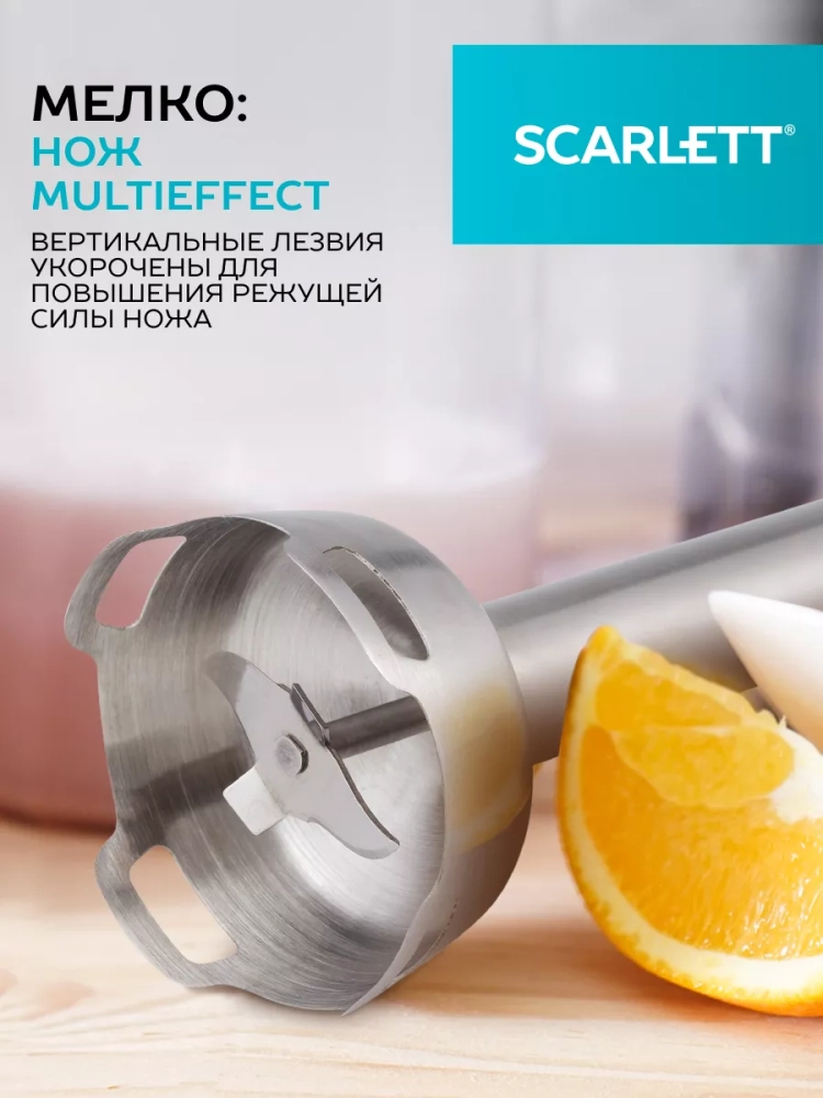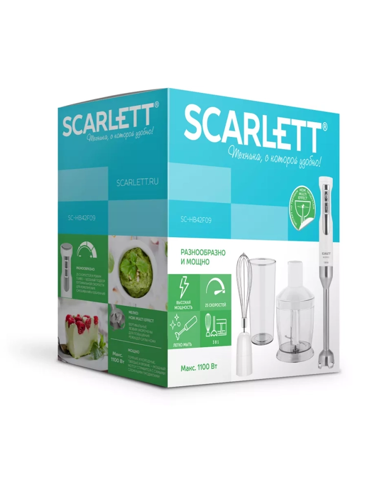 Погружной блендер Scarlett SC-HB42F09 - универсальный кухонный прибор. В комплекте идут насадки для смешивания, измельчения, взбивания, а также мерный стакан.