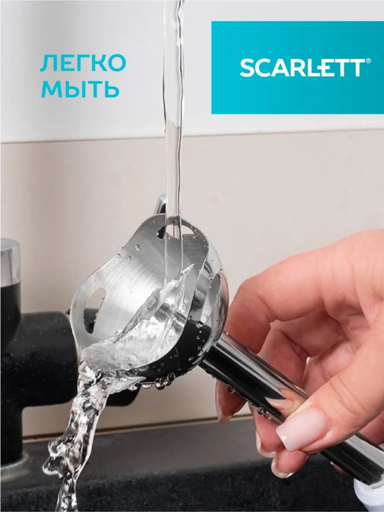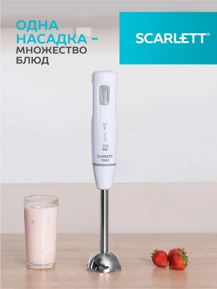 Погружной блендер Scarlett SC-HB42S13 – универсальное устройство, выполненное в классическом белом дизайне, дополненном серой кнопкой.